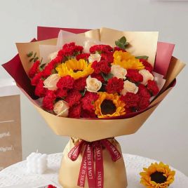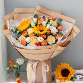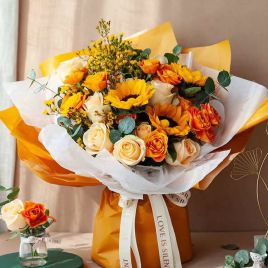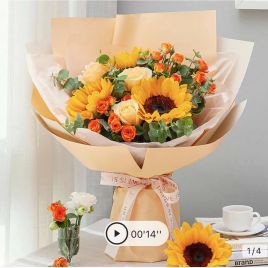 韩式系列/一路向阳-向日葵3枝、香槟玫瑰9枝、橙色多头玫5枝、黄色腊梅5枝、大叶尤加利5枝 花艺师打造 韩式花束系列¥299 ¥485商品号: #242 有货: 有货 韩式系列/一路向阳-向日葵3枝、香槟玫瑰9枝、橙色多头玫5枝、黄色腊梅5枝、大叶尤加利5枝 花艺师打自营