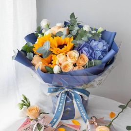 星河璀璨-香槟玫瑰9枝、蓝绣球、向日葵、白色洋桔梗、大叶尤加利 倾情设计,灿若星河¥298 ¥455商品号: #244 有货: 有货 星河璀璨-香槟玫瑰9枝、蓝绣球、向日葵、白色洋桔梗、大叶尤加利 倾情设计,灿若星河自营